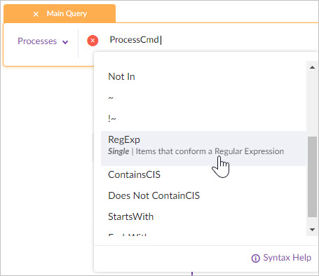 The interface assists in building the correct syntax by providing completion suggestions and a one-click command palette. This saves time and spares threat hunters — even those unfamiliar with the syntax — the pain of remembering how to construct queries.
