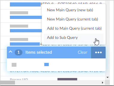 In the Console’s Forensics view, copy the hash of the detection. In the Visibility view, begin typing in the query search field and select the appropriate hash algorithm from the command palette. Select or type =, then paste the hash to complete the query.
