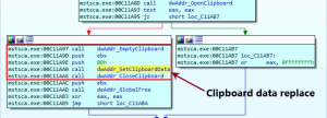 The replaced wallet addresses are copied to the current clipboard. The clipboard is cleared using EmptyClipboard and then the new data containing malware's wallet addresses is copied to clipboard using SetClipboardData.