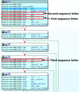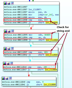 The mstsca[.]exe does the main clipboard hijacking activity. This again checks for mutex "M5/610HP/STAGE2" to confirm single instance is running at a time. The clipboard data is retrieved using GetClipboardData API. This data is then checked for string terminatore to check for separate strings in data.