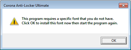 This malware uses “Perfect DOS VGA 437 win” font to display information in Windows Forms. Thus upon execution, it ensures “Perfect DOS VGA 437 win” font is installed by first checking presence of “FONT_FILE.ttf” file in the system. A warning message with an “OK” button is displayed to the victim if the specified font is not found in the system. This warrants font installation.
