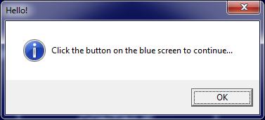 Any key press displays an information window named “Hello!” instructing the victim to click on the blue screen's "continue" button:
