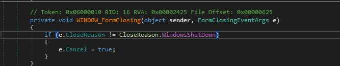 Below code snippet from d0ntcl1ckh3r3_start_.exe shows, any event besides the Windows shutdown which attempts to close the form is disregarded.