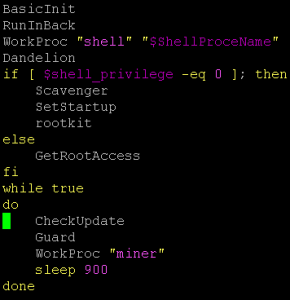 This Trojan comes as a bash file with over 800 lines of codes. Its main function is to mine cryptocurrency using the Stratum mining protocol and cryptonight algorithm on pools such as supportxmr.com, minexmr.com, poolin.com, dwarfpool.com, nanopool.com and f2pool.com. To gain root access and basically full control of the victim machine it uses BRootkit, leverages a vulnerability - CVE-2016-5195 and uses BillGates Linux malware.