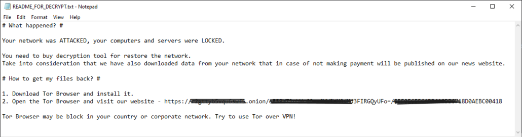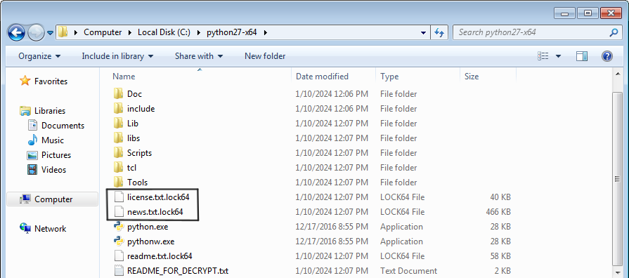The encrypted files names are appended with a .lock64 extension and the file README_FOR_DECRYPT.txt is created in that directory.