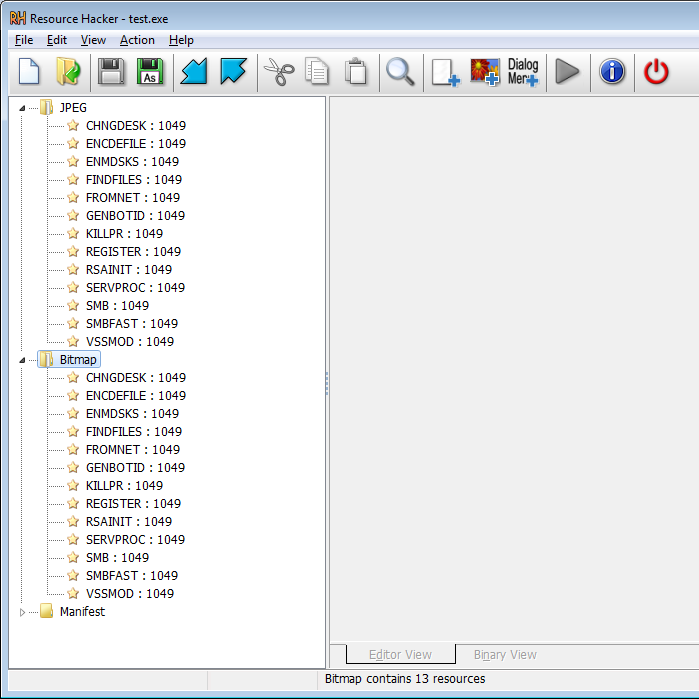 The ransomware hides its different tasks that are to be performed in bitmaps, which are kept in the PE resource section. Before it runs each task, it copies the binary code from the bitmap to a memory buffer allocated earlier. The imports used by each task are also stored in the resource section under "JPEG" with the same names as the bitmaps.