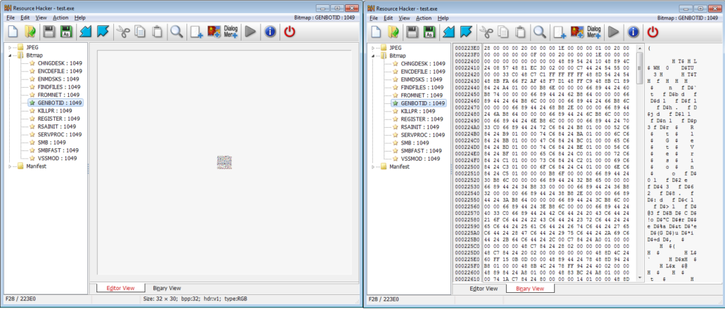 Once the binary code of the GENBOTID bitmap is loaded into the memory, it loads the corresponding name resource file into memory using the FindResource and LoadResource APIs.