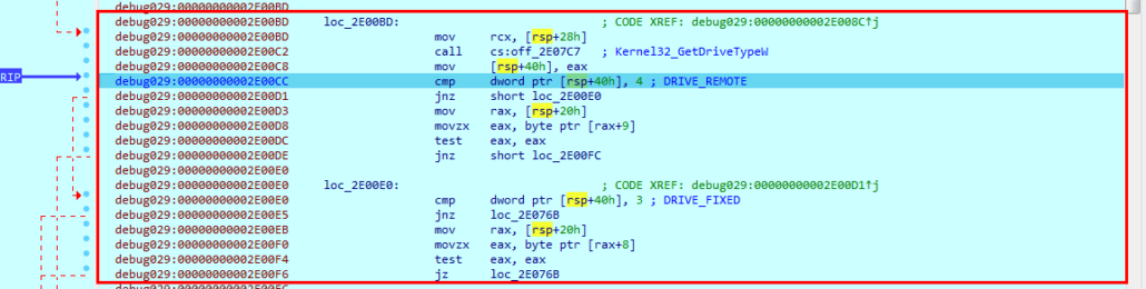 For enumerating the disk, it uses GetLogicalDriveStringsW to get the list of all drives on the system. The drive letters are then converted into lowercase, and only those drives that are DRIVE_REMOTE or DRIVE_FIXED are processed.