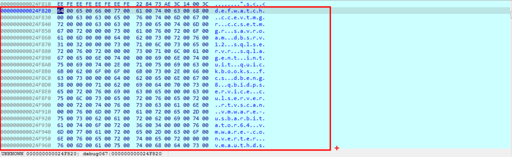 It has a hardcoded list of the service names to be stopped from running on the victim’s system.