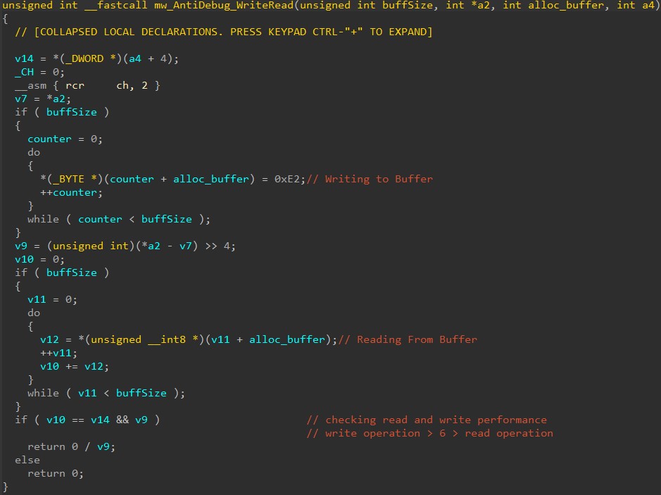 Here, malware allocates large memory buffer with PAGE_WRITECOMBINE flag, where it first writes and then reads from it, evaluating read/write performance. Malware loops this check 32 times and compares that write performance is at least 6th times more than read performance.