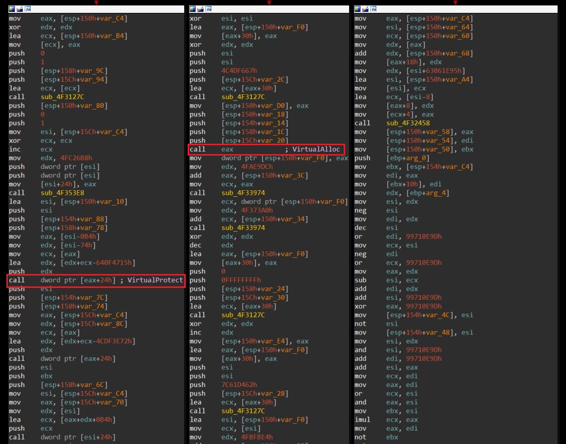 Malware does an extensive use of obfuscation. This makes it exceedingly difficult to statically analyze anti-analysis tactics and figure out how to get malware to unpack itself by passing all the checks. Malware uses API hashing to retrieve API addresses. Malware only uses VirtualAlloc and VirtualProtect API's to unpack next layer.