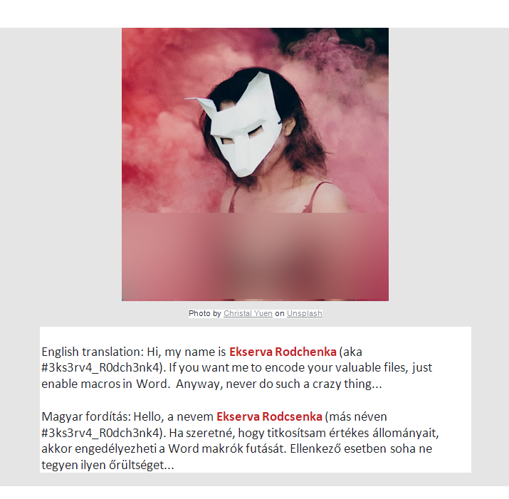 The SonicWall Capture Labs threat research team has observed reports of Hungarian PC users infected by Exerwa ransomware. It is reported that Exerwa is CTF malware that emerged from a Capture-the-Flag event where hackers are tasked to build functional ransomware in the shortest possible time. Unfortunately, some code from this event has ended up in the wild. The code is very basic and the initial infection vector is via a word document using macros.