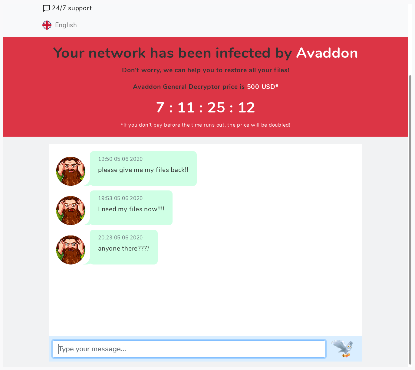 The site provides a chat interface in order to communicate with the operators and possibly negotiate. We tried to reach out to the operators using this interface but received no response: