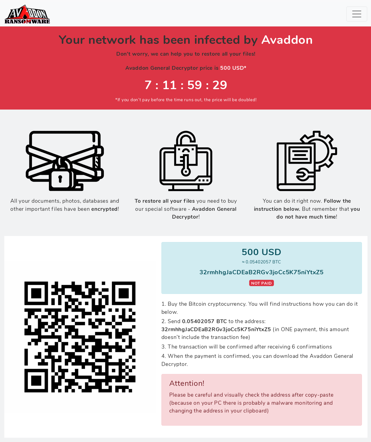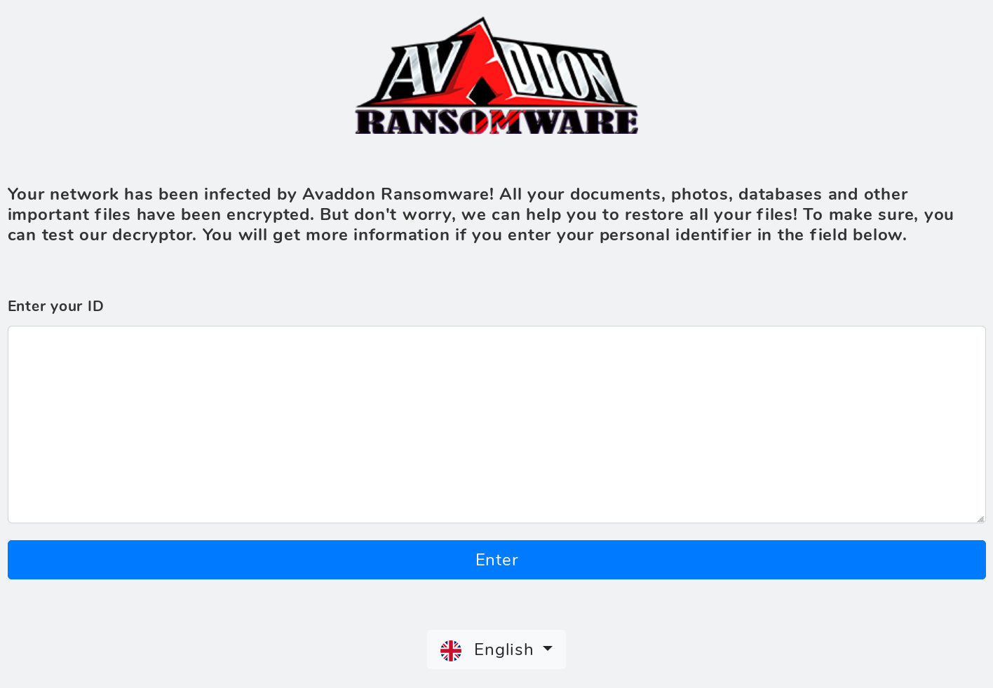 avaddonbotrxmuyl.onion leads to the following page hosted on the tOr network:
