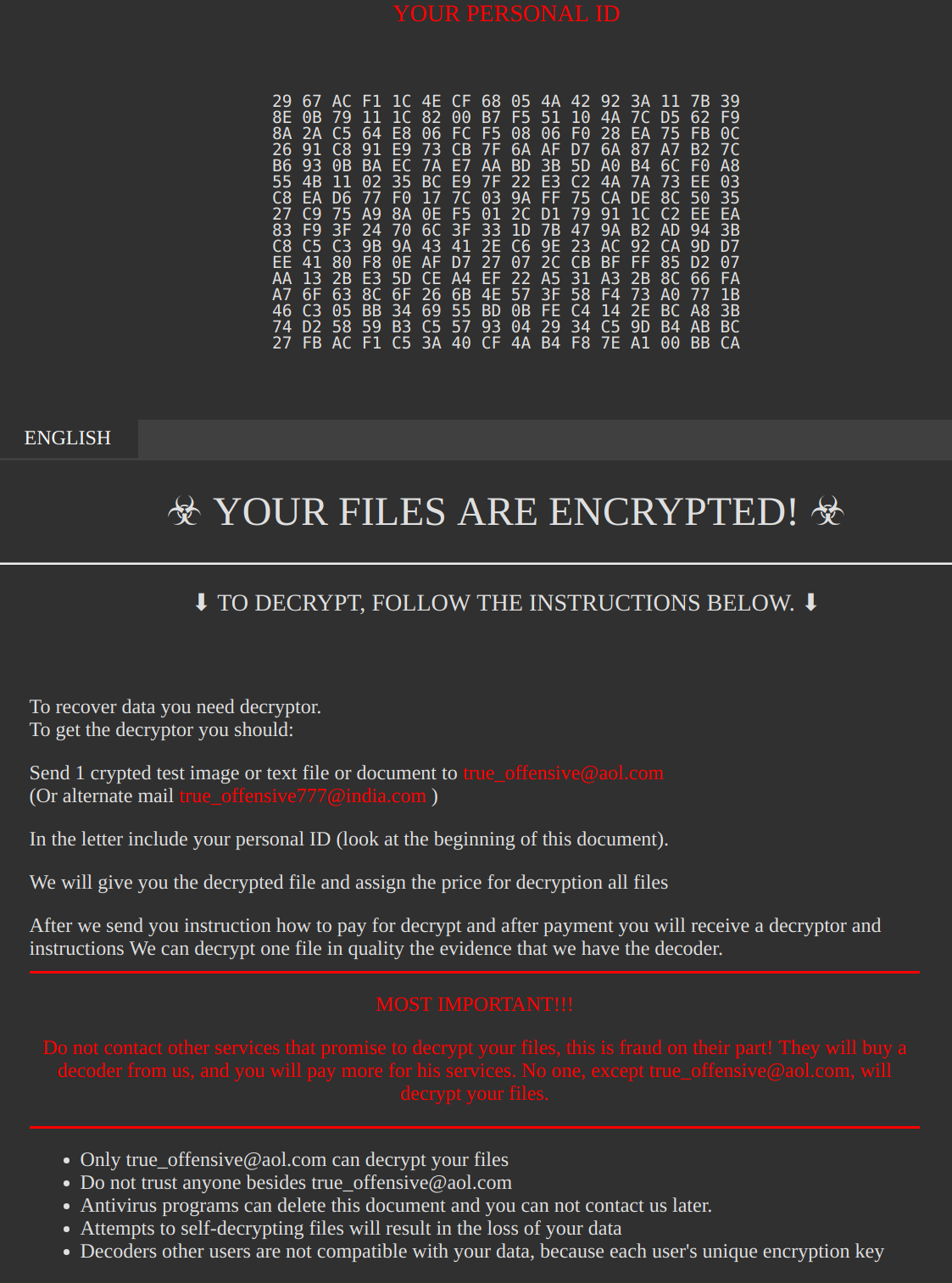 The page contains data on steps needed to recover files. We wrote to true_offensive@aol.com and received the following reply: