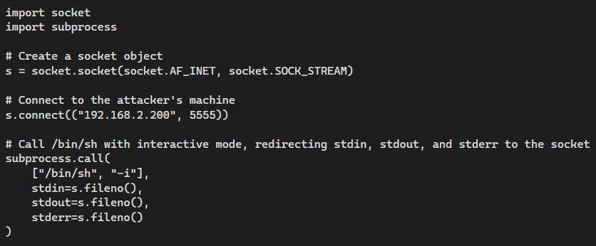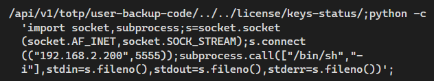 This one-liner Python command (Figure 5) is crafted to establish a reverse shell from the target server to the attacker's machine. This command, when appended to the vulnerable endpoint, would be executed on the server due to the vulnerability. The Python script, starting with a semicolon to signify the end of a previous command, is a compact and potent snippet designed to create a socket connection back to the attacker’s machine (at IP address 192.168.2.200 and port 5555).
