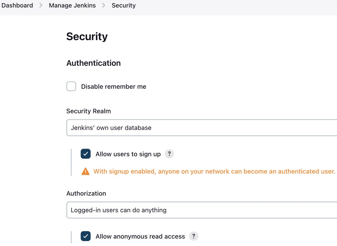 Some Jenkins’ features make this vulnerability easier to exploit. As shown in the figure below, the “Allow users to sign up” option allows anyone with access to the Jenkins server to self-register an account. And the “Allow anonymous read access” option gives any random user the Overall/Read permission.
