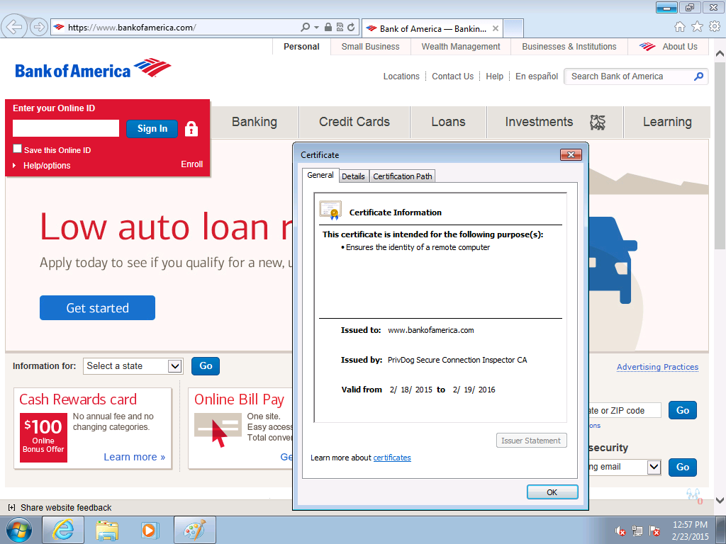The private key used by Komodia SDK that ships pre-installed with some Lenovo laptops has been compromised, and presents a breakdown of trust between web browsers and secure websites. Komodia SDK-based software establishes, what is essentially a Man-in-the-Middle (MitM) between your browser and the HTTPS/SSL sites you visit, for example, like your bank. It creates a public-private key pair and inserts the public key as a Root Certificate Authority (CA) certificate on your machine. This means that an attacker can use this cracked private key to create spoofed SSL Certificate for a spoofed site. The Komodia SDK-based software will trust the certificate that has been installed into your Root CA store and you will not notice a thing. The only thing you will notice if you click on the lock icon in your browser address bar is that the certificate from your bank has an "Issued by: Superfish, Inc.". Other software that uses the Komodia SDK includes PrivDog and others. PrivDog, for example, is advertised as a privacy and secure browsing program. Like Superfish it creates a MitM between your browser and secure websites.