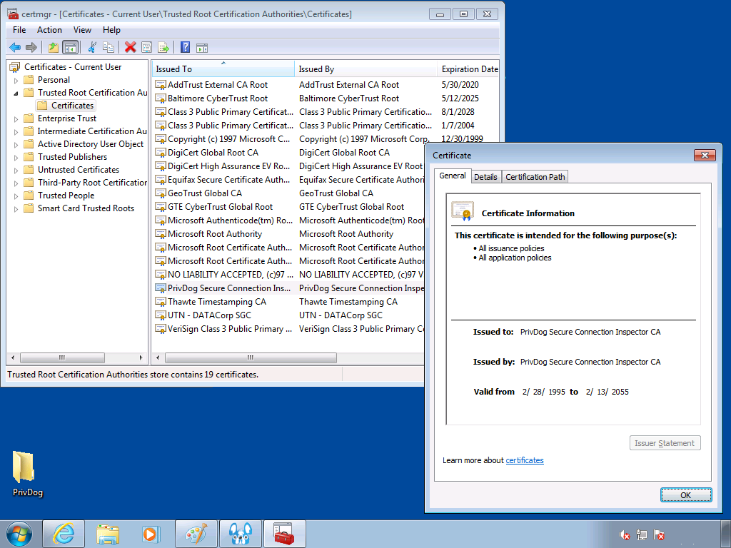 This image shows the PrivDog Root Certificate Authority installed on your machine: