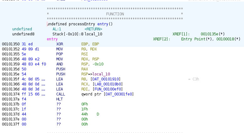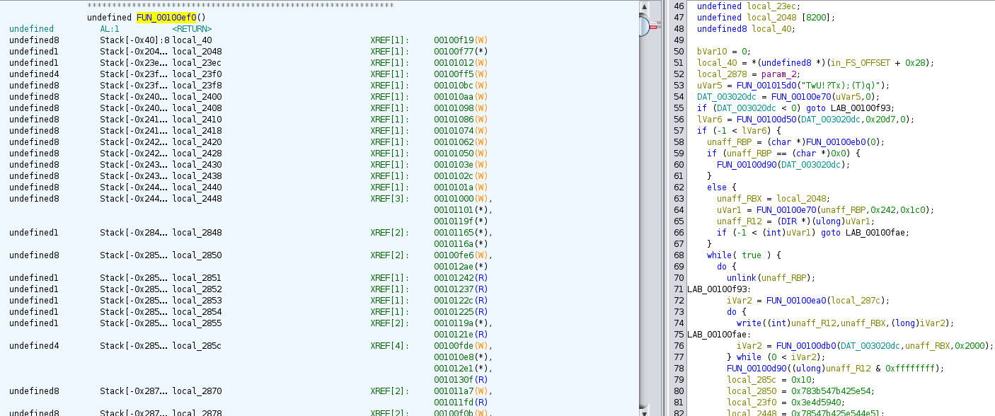 The entry point immediately jumps to function FUN_00100ef0 to begin code injection and infection of the system.