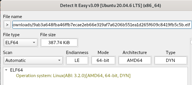 The file is detected as a 64-bit ELF binary with no packer, protector, or encryption.