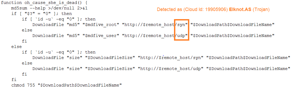 It also downloads a known DDos botnet called Elknot or BillGates.
