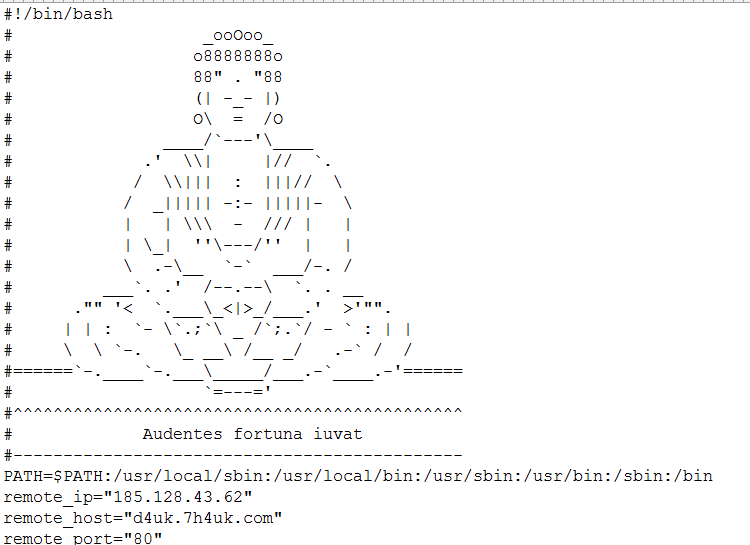 The Trojan arrives as a bash script. The script starts off with the usual bash shebang followed by an image of Buddha and a reference to a Latin proverb “Audentes fortuna iuvat” before the actual lines of code begin.