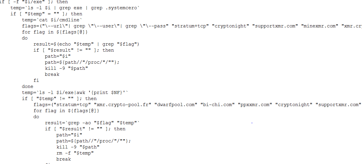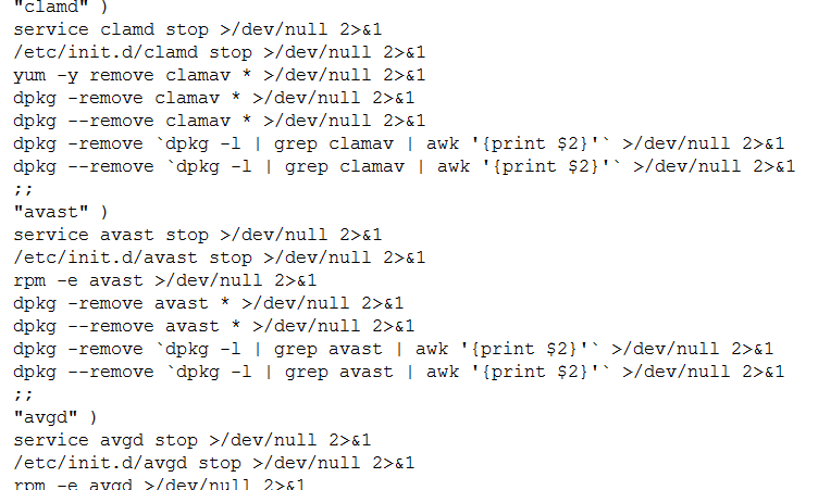 The Trojan checks for existence of known Linux antivirus services such as safedog, aegis, yunsuo, clamd, avast, avgd, cmdavd, cmdmgd, drweb-configd, drweb-spider-kmod, esets and xmirrord. The script then kills these processes and completely removes them from the system using the dpkg utility.