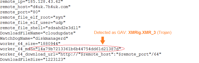 The Trojan uses the remote host d4uk.7h4uk.com which has been seen associated with different malwares. The main mining Trojan is an ELF file based on XMRig, a Monero (XMR) CPU miner.