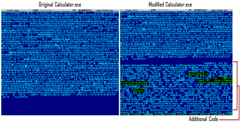 We compared an original .exe file with the same file post-infection side-by-side as seen in the image below. We can clearly see that malicious code is appended to it.