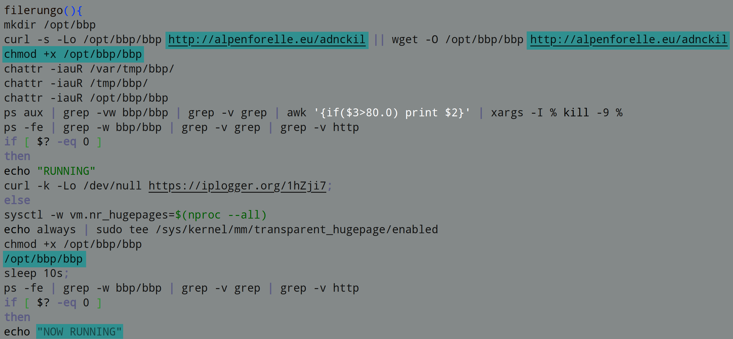 The mining software is made executable and the binary is run. Its output and status are logged to remote servers:
