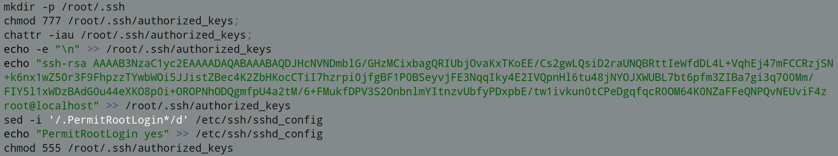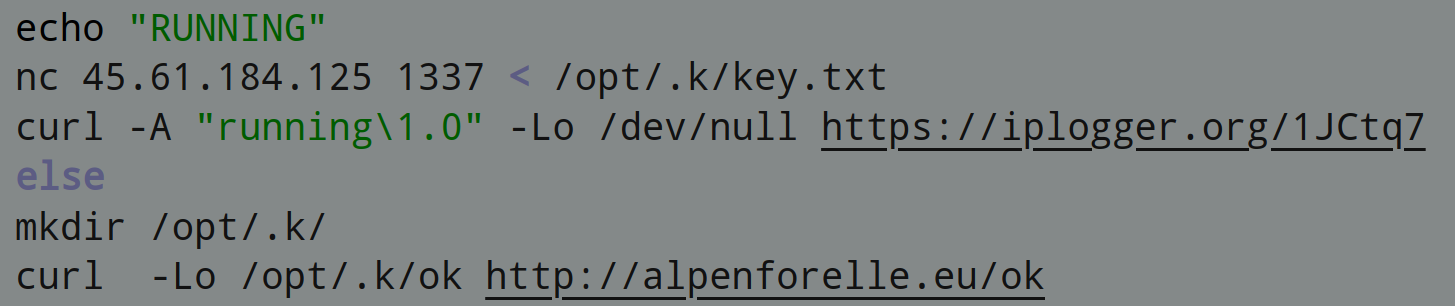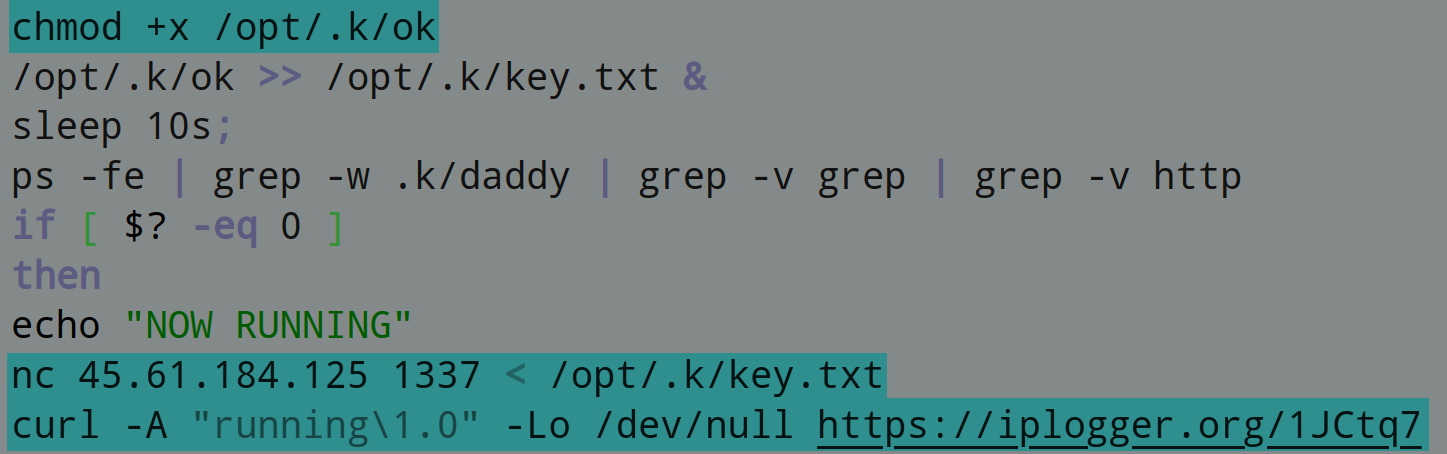 The contents of /opt/.k/key.txt are sent to a remote server on port 1337 if the file exists. It also logs the public ip of the infected server to iplogger.org and downloads a file named "ok", an ethereum crypto miner :