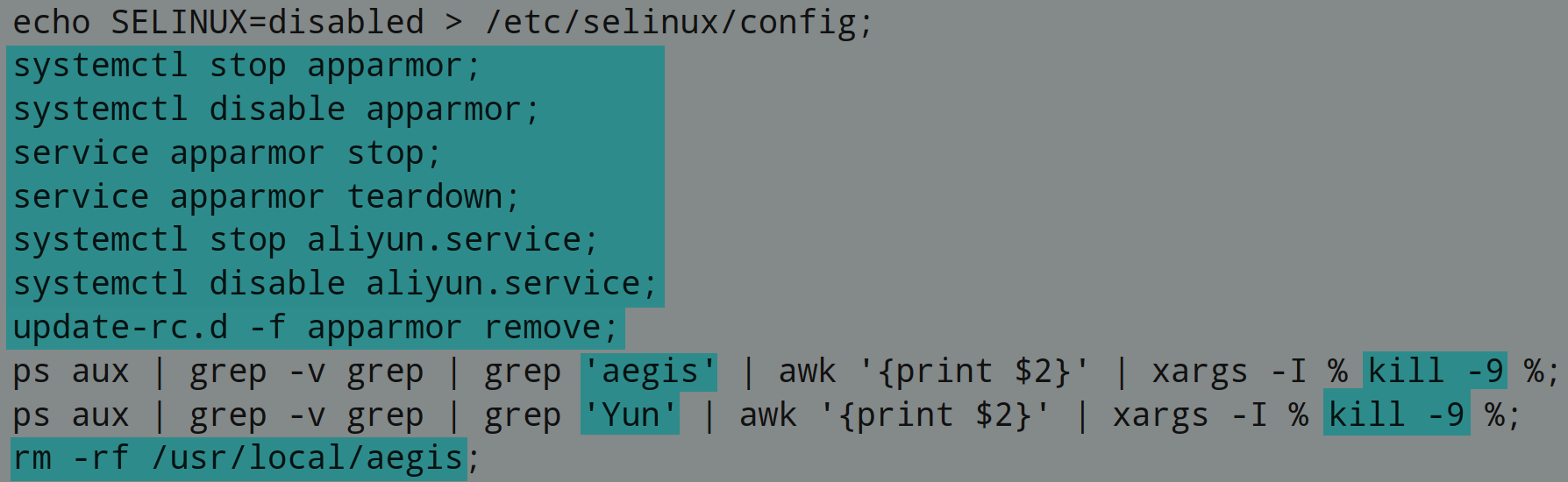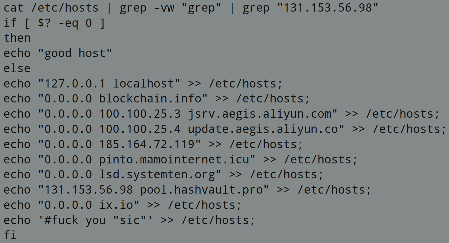 The job of sesa.txt is to disable various security features that may be present on the system. It disables outgoing network connections to services related to Alibaba cloud security via the hosts file: