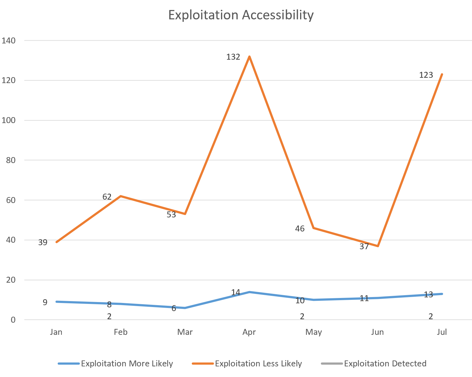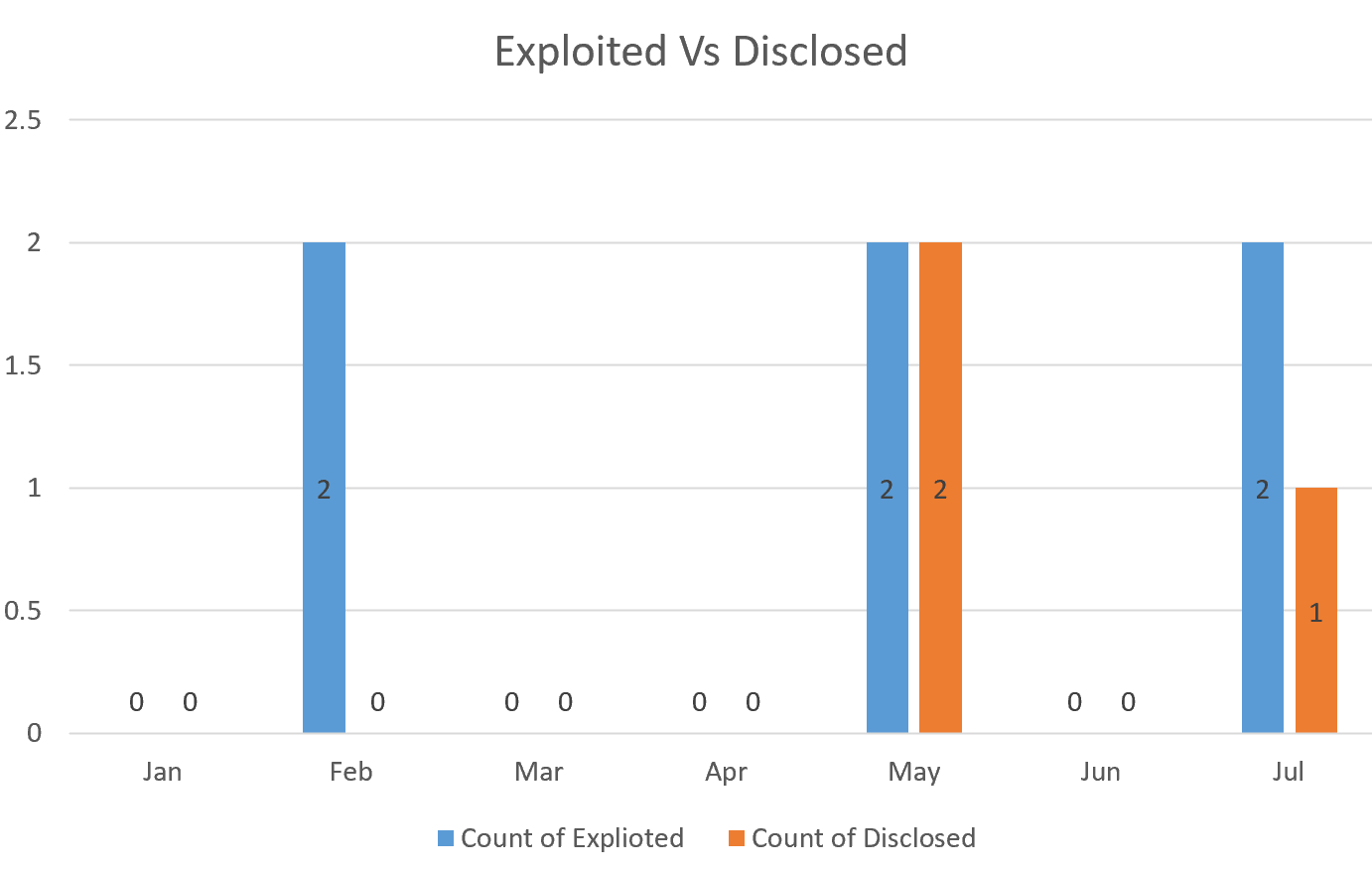 Microsoft tracks vulnerabilities that are being actively exploited at the time of discovery and those that have been disclosed publicly before the patch Tuesday release for each month. The above chart displays these metrics as seen each month.