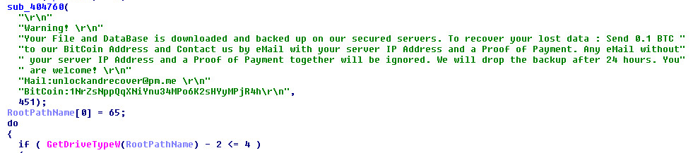 SonicWall Capture Labs Threat Research Team, recently found, MongoLock ransomware. MongoLock tries to remove files, along with formatting drives using special commands through "cmd" and targets databases with weak security settings. MongoLock will drop a ransom note in the form of a "warning.txt" using notepad or as an entry inside any database it may find on the system. This is a new form of MongoLock ransomware that is actively being used in the wild today with a global reach. The ransom note is asking for 0.1 BTC to a specified Bitcoin wallet. A picture of the ransom note is below: