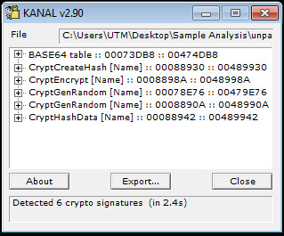The following crypto signatures were found, Base64, CryptCreateHash, CryptEncrypt, CryptGenRandom, CryptHashData.