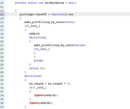 A typical type of exploit using this vulnerability is to add an extra layer of obfuscation to the exploit Action Script code into a second flash file--which is embedded as a binary within the outer Flash file. The following image shows the decompiled outer SWF file. Here you can see that there is a binary byte array included in in the outer SWF file: