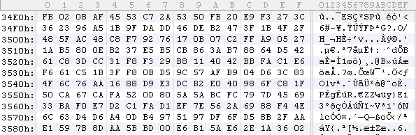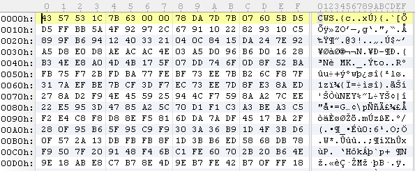 This image shows the encrypted bytes of the binary file (which will be retrieved through a ByteArrayAsset class of Action Script and decoded):