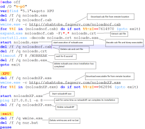 nur.bat starts initially and makes provision for additional malware download and execution besides removing infection footprints. It uses wmine.exe to download OS specific additional malware file from remote location: