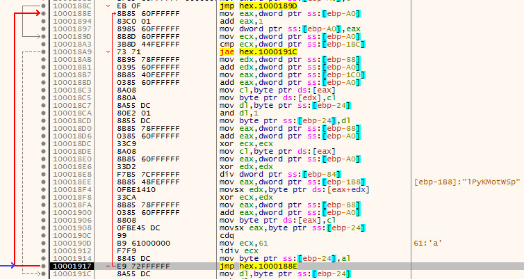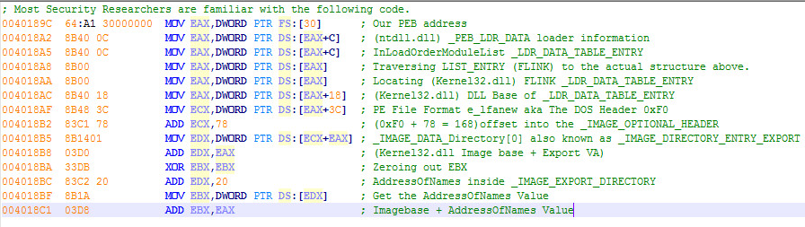 The malware author tries to hide the loading of Kernel32 dll, However you can see it within a debugger. This slow loading one character at a time is needed to bypass signature filters. You can also see the junkcode between the characters of Kernel32 dll. It's always interesting to watch how malware authors bypass signature enforcement within their shellcode.
