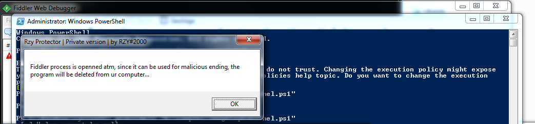 Executing the malware while fiddler is running on the machine, we get the message below: