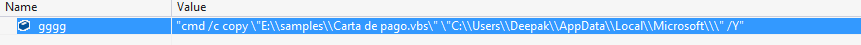 The VBScript makes registry entry into “HKEY_CURRENT_USER\Software\Microsoft\Windows\CurrentVersion\Run” to ensure it executes on system start and copies itself into “C:\Users\\AppData\Local\Microsoft\Carta de pago.vbs”: