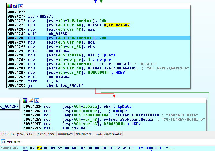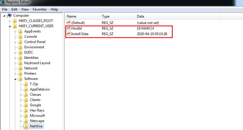 The malware creates registry entries into HKCU\Software\NetWire which includes host id and current time: