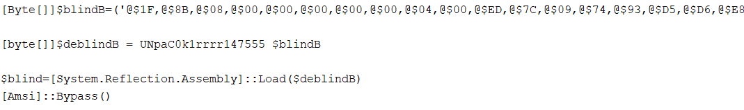 The PowerShell script replaces "@$" with "0x" in $blindB byte array to decompress and load the AMSI bypassing Dynamic Link Library.