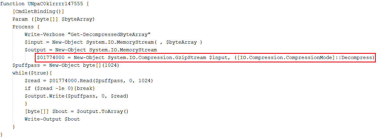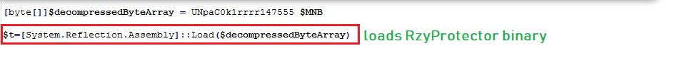 The PowerShell script has function “UNpaC0k1rrrr147555” that performs gzip decompression to get the Portable Executable (PE) component files for the malware. The component PE files are AMSI bypassing module and Rzy Protector module: