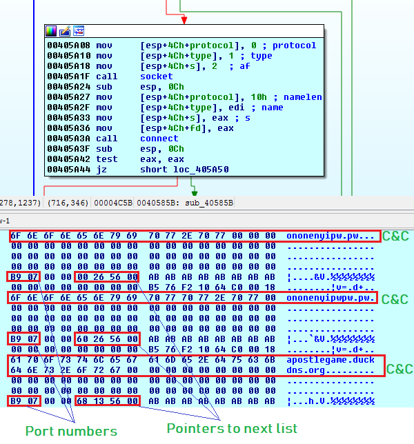 The malware keeps 3 Command and Control (C&C) servers with port numbers and a localhost Internet Protocol (IP) address into a circular linked list. The malware keeps iterating the circular linked list and tries to connect each IP address after a sleep period of 40 seconds:
