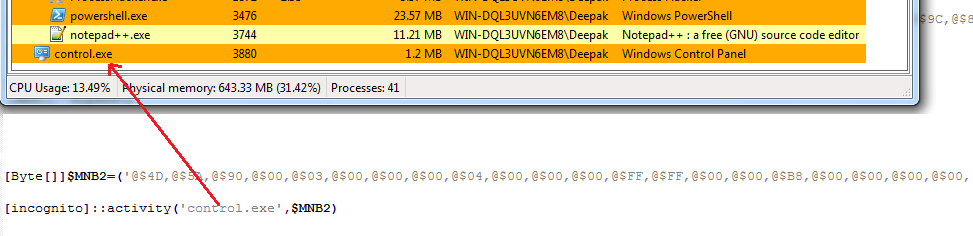 The PowerShell script finally executes the NetWire RAT binary as "control.exe":